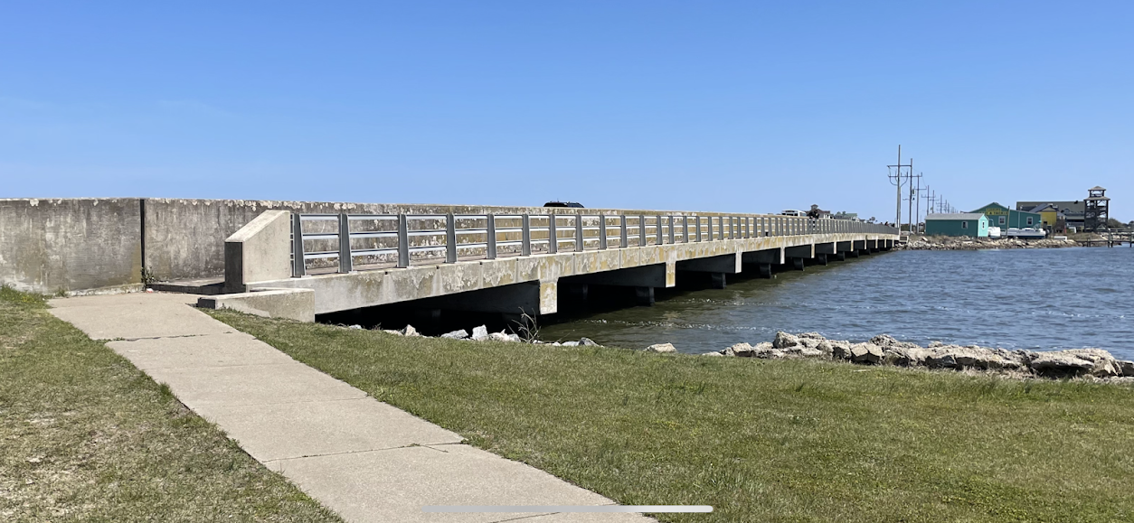 The Daniels Bridge is located in the town of Nags Head on Rt. 64/264 Manteo Causeway just west of Whalebone Junction. The concrete structure is easily accessible to a guarded walkway on the south side of the bridge. A five foot concrete barrier on the south side provides protection from wind and traffic. The north side was closed last year due to pedestrian safety issues.