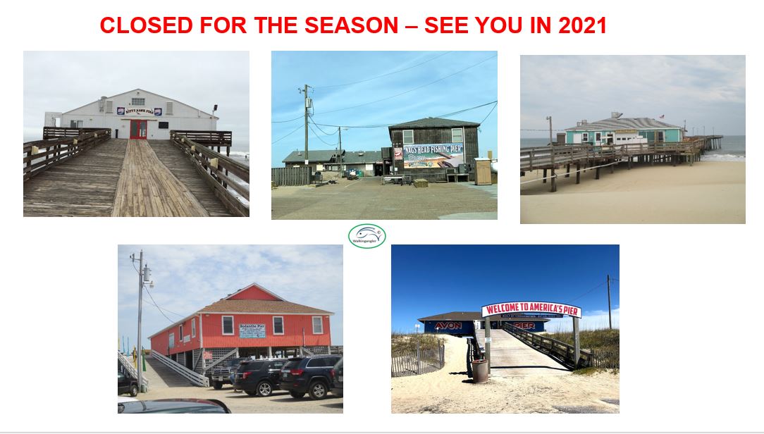 Kitty Hawk / Hilton Garden fishing Pier – should remain open for hotel guests but other anglers may be permitted to fish there. Anglers must check at the front desk – for open days, means of access and specific times.